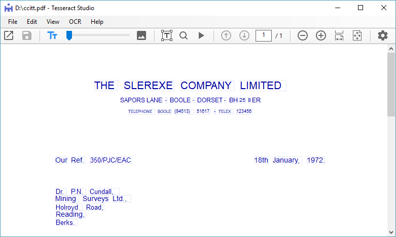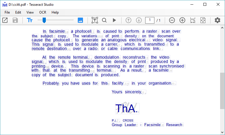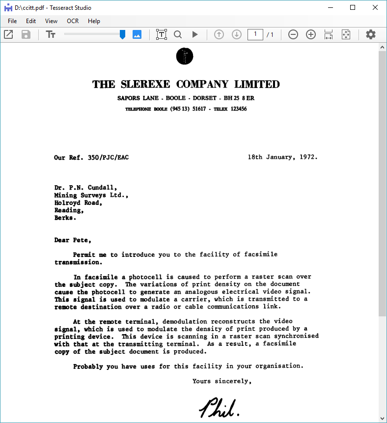 In this section we will use a classic TIFF sample file from CCITT which has been converted to a searchable PDF using Tesseract OCR.