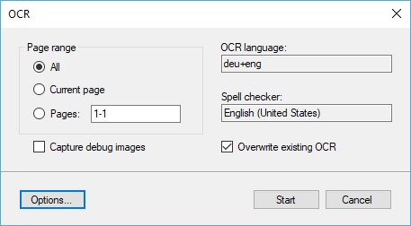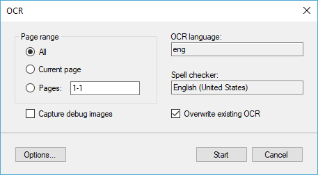 To run the OCR process, select the “Start OCR…” command from the OCR menus, specify the pages that you wish to process and click the Start button.