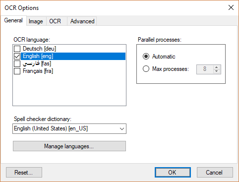 On the General tab, you can select OCR and spelling languages as well as the number of parallel processes that can be used to accelerate OCR of multi-page documents.