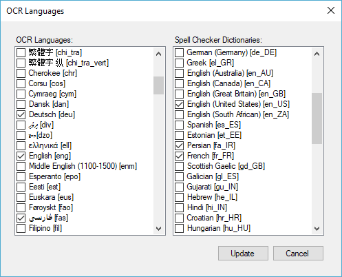 The selection of the OCR and spelling languages is limited to the languages files that have been installed in the computer. You may install or remove these language files using the Manage Languages option: