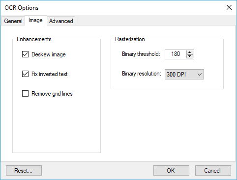 The Image tab displays a few experimental image enhancement options for dealing with more complex documents. Depending on the source images, these options may or may not affect the accuracy of the OCR data. More options will be added to this list in subsequent releases.