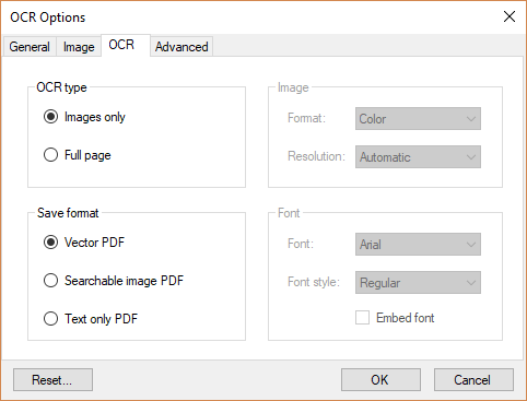 Searchable image PDF is a rasterized PDF page with the text hidden behind the image. This option enables you to control the size of the file by selection the image resolution and color depth.