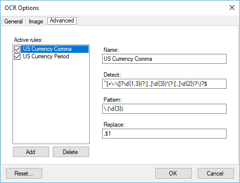 The Advanced tab uses regular expressions to post process OCR data and make certain substitutions based on patterns detected in the OCR data. The two included rules try to detect and correct common OCR mistakes with currency amounts that are in US format. These expressions are for illustration only.
