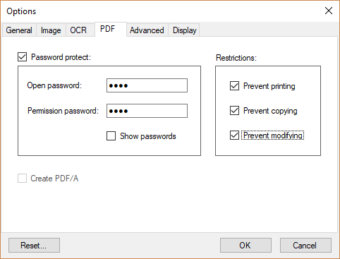 You may use the PDF tab on the options dialog to select parameters that will apply to all subsequent OCR operations. The PDF/A option will create PDF files that conform to the PDF/A standard for archiving. You may also choose to save PDF files encrypted with a password. You may only use one of these options as PDF/A does not allow encryption.