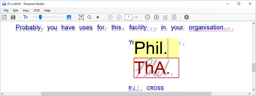 The only OCR mistake in this document is the cursive signature which has been mis-recognized as “ThA.” instead of “Phil.”. To correct this problem, we click on the word which opens an edit box, allowing us to replace the text: