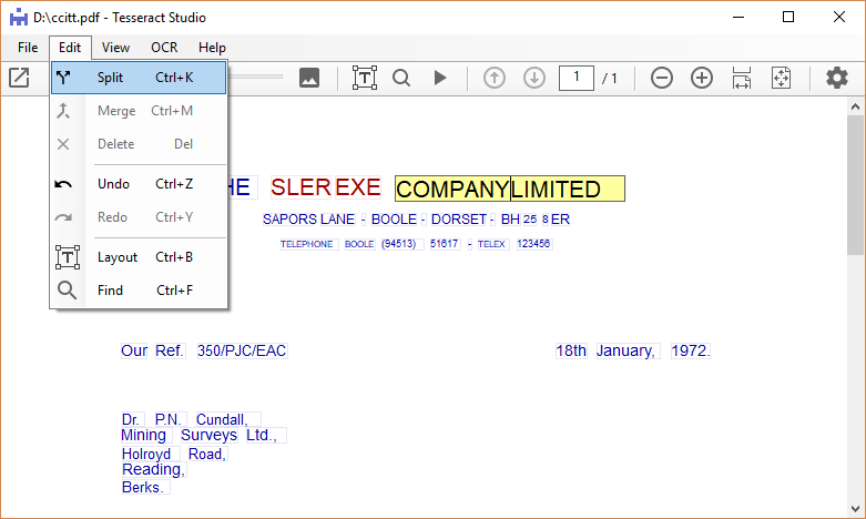 TessStudio can correct these mistakes by splitting a word at the cursor location or by merging two adjacent words. In both cases, you need to select a word and then right click and use the context menus to split or merge words.